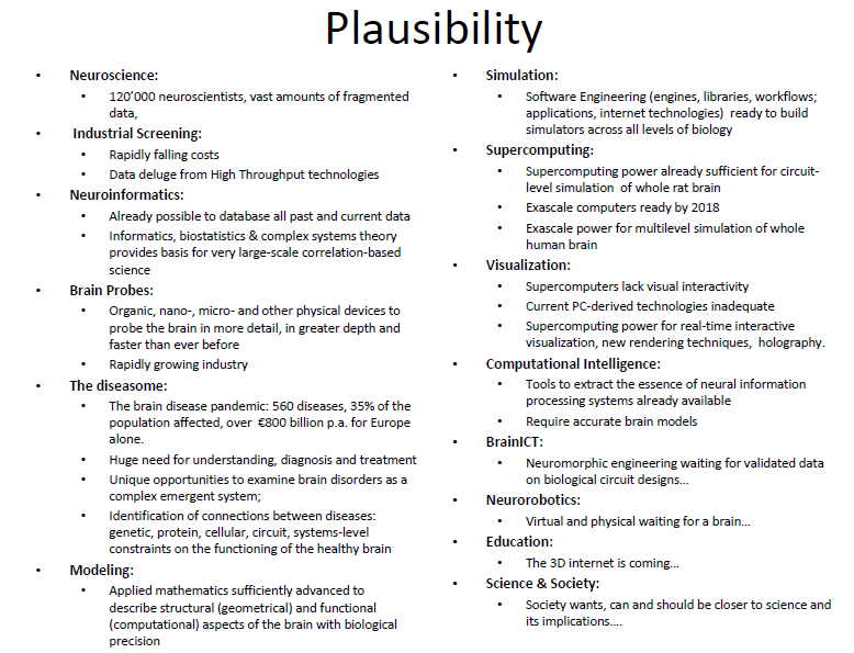 Here is a Henry Markram presentation about the human brain emulation project and its plausability The project is one of six projects that could be funded with up to one billion euros. Exascale supercomputers (supercomputers with exaflop performance) should be sufficient for whole human brain emulation using multi-level simulation.