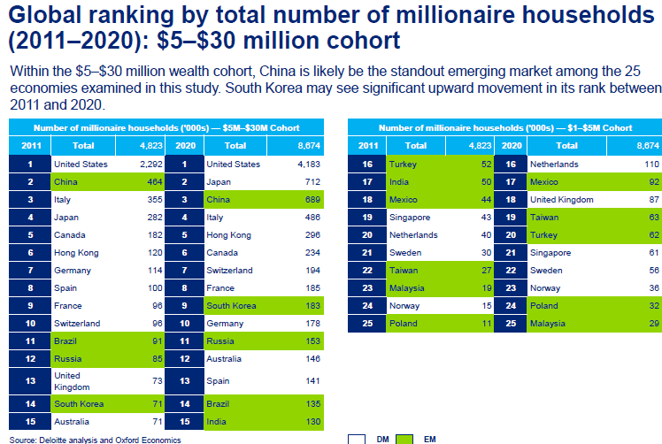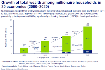 According to a Deloitte Center for Financial Services sponsored study, wealth among millionaire households could more than double over the next decade in 25 major economies, growing from an estimated $92 trillion this year to $202 trillion in 2020. The study provides estimates of the number of households with net wealth in three distinct cohorts of $1 million- $5 million, $5 million- $30 million, and $30 million plus across 25 economies. In 2020, 43 percent of the world’s wealth held by millionaire households is predicted to be in the U.S. while the number of millionaire households in the U.S. is projected to increase from an estimated 10.5 million in 2011 to 20.6 million in 2020.