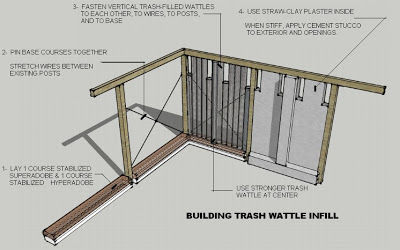 Hyper-wattle upper walls are based on proven straw-clay or light wood chip clay (leichtlehm or terre-paille) used for timber frame infill in Europe and the US. A matrix of mesh and light outer reinforcements will transform this into a structural skin material strong enough for modest-sized single story buildings with light-weight roofs. Placing these clay rich tubes on rubble and/ or earthen base walls gives extra strength and moisture-resistance and allows high-quality earthen wall construction at low cost.
