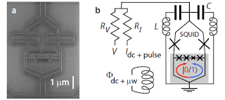 a, Scanning electron micrograph (SEM) of a device (qubit and SQUID shown) with identical design parameters as the one measured during this work [1]. b, Schematic. Qubit loop (shaded) and galvanically coupled read-out SQUID. The crosses are Josephson junctions; R, bias resistors; C, shunt capacitances; L, inductances.