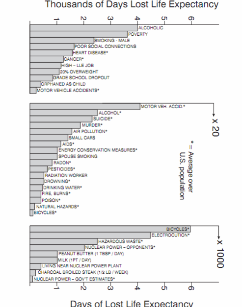 Risks in Perspective by BernardL.Cohen,Ph.D. 2003. the Journal of Physicians and Surgeons (H/T Al Fin) Perhaps the most meaningful way of putting risks into perspective is to consider the loss of life expectancy (LLE) that they cause. The chart is mostly for US cities. World poverty and air pollution have larger impacts on populations outside the United States.