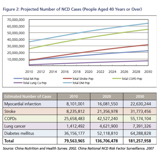 Non-communicable chronic diseases (NCDs) are the leading cause of death in China, accounting for close to 70 percent of the disease burden and over 80 percent of the 10.3 million deaths caused by all diseases annually. The four leading NCDs in China are cardiovascular diseases (CVDs), diabetes, cancer and chronic obstructive pulmonary diseases (COPDs).