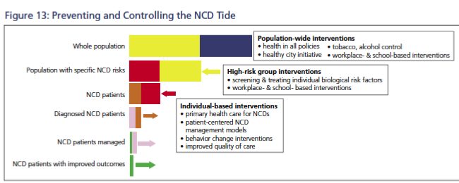 • The first two groups of interventions could be financed through the priority public health programs for NCDs and implemented at the national level. The third and fourth groups can be financed through health insurance schemes.
