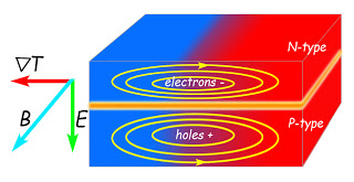 An n-type semiconductor on top of a p-type semiconductor creates a vertical electric field (E, green arrow), while diffusion creates a depletion layer near the junction (orange), where the electric field is strongest. Heating one end of the device creates a heat gradient at right angles to the electric field (del T, red arrow). Electrons and holes moving in these fields are forced into loops of current, and a magnetic field is generated “sideways” (B, blue arrow), at right angles to both electric and thermal fields.