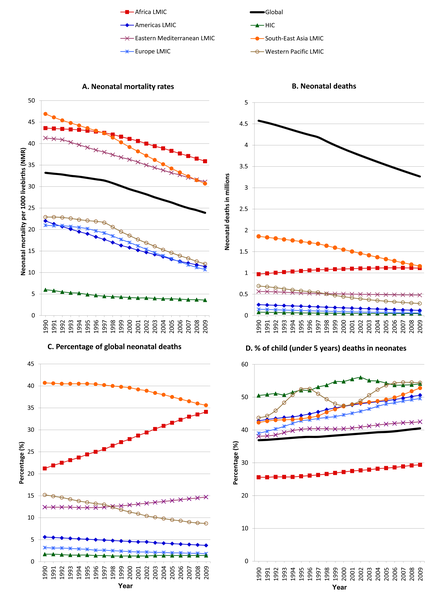 Neonatal mortality — deaths in newborns, aged 3 weeks and under — has declined in all regions of the world over the past two decades but in 2009, more than half of all neonatal deaths occurred in five countries—India, Nigeria, Pakistan, China, and the Democratic Republic of Congo. Furthermore, over the past 20 years, more than 4% of all babies born live in India died during the first month of life. Historically, the main focus of studies of childhood mortality has been the infant and under-five mortality rates. Neonatal mortality (deaths under 28 days of age) has received limited attention, although such deaths account for about 41% of all child deaths.