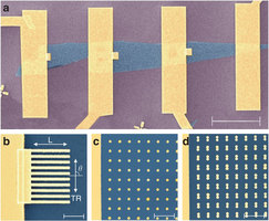 Scanning electron microscopy micrographs of the graphene devices with plasmonic nanostructures.