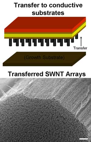 A method developed at Rice University allows bundles of vertically aligned single-wall carbon nanotubes to be transferred intact to a conductive substrate. Metallic layers added via atomic layer deposition create a solid-state supercapacitor that can stand up to extreme environments.