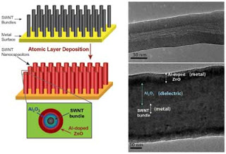 Carbon nanotube bundles are at the center of supercapacitors developed at Rice University. Arrays of nanotube bundles are coated via atomic layer deposition to create thousands of microscopic devices in a single array. The electron microscope images at right show the three-layer construction of one of the supercapacitors, which are about 100 nanometers wide.