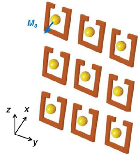Example of a non-reciprocal bi-anisotropic metamaterial geometry, which explicitly violates spatial and time reversal symmetries. An elementary unit of the split ring-based “perfect magnetoelectric metamaterial” design is supplemented with a magnetized ferrite particle. The particle is magnetized and shifted along the x-direction with respect to the center of the split ring. The particle magnetization is proportional to the required gx in a given location.