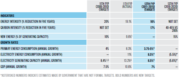 Targets disclosed early 2011 Latest targets for 2015 Hydropower 250 260 Wind 90 100 Solar 5 10 Bio-energy 13 13 Geothermal N/A 0.1 Tidal wave N/A 0.01-0.02 Nuclear is targeted for 40 GW which is the equivalent of 200 GW of solar and 160 GW of wind. Higher capacity factor for nuclear.