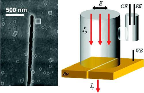 CNST researchers describe a new high-contrast, low operating-voltage, electrochemical optical switch that uses a volume of active dye orders-of-magnitude smaller than that of conventional electrochromic devices. Electrochromism refers to a reversible change in the optical absorption of a material under an applied voltage. Inorganic and organic electrochromic materials are used in displays, smart windows, and car rearview mirrors. A change in light absorption in such a material is caused by a change in the oxidation state, and requires that both ions and electrons diffuse through the material. Decreasing the material’s thickness reduces the diffusion time, making the electrochromic switch faster, but unfortunately also reduces the contrast. The NIST and University of Maryland researchers have grown crystals of the electrochromic dye Prussian Blue inside a gold nanoslit waveguide where light propagates as a surface plasmon polariton (SPP). SPPs are collective charge oscillations coupled to an external electromagnetic field that propagate along an interface between a metal and a dielectric. The dye nanocrystals, deposited on the sidewalls of the slit by cyclic voltammetry, can be electrochemically switched to provide a transmission change ≈ 96 % (in the red) using control voltages less than 1 V. The high switching contrast is enabled by the strong spatial overlap between the SPPs and the nanocrystals confined within the slit. The contrast is also enhanced by the unexpectedly high absorption coefficient of Prussian Blue nanocrystals grown on a gold surface compared with bulk material. The switch operates efficiently even with a relatively low fill fraction of active material in the slit (≈ 25 %), leading to a large contact area with the electrolyte. Because the light propagates in a direction perpendicular to the direction of the charge transport between the electrolyte and the ultrathin dye layer inside the nanoslit, the new switch design offers significant promise for creating electrochromic devices with record switching speeds.