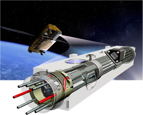 The device ‘swooshing’ into a satellite is the vacuum tube, one of the main components of an atomic clock that will undergo a technology flight demonstration.
