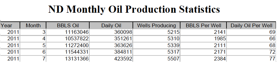 North Dakota had a record of 423592 barrels of oil per day in July, 2011 This was an increase of 39,000 barrels of oil per day over the previous record in June of 384811 barrels of oil per day.