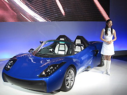 Toray Industries’ Teewave AR1 carbon fiber concept car is seen at an event in Tokyo on Sept. 14. (Mainichi) Toray Industries, which got its start making rayon and is now the largest producer of carbon fiber. Teijin, another company that began in textiles, also presented a concept car based on carbon fiber in March this year. The two companies are beginning a major push to market carbon fiber to car companies as a serious substitute for the heavier steel-based designs of today. Even with a 200-kilogram battery, this car weighs 846 kilograms which is about half the weight of a comparable regular car.