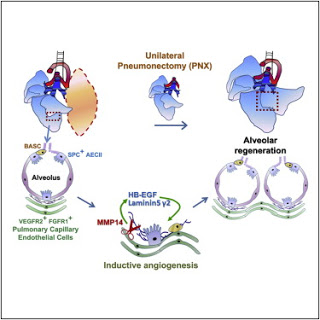 When the investigators disabled receptors of VEGF and FGF-2 specifically in the endothelial cells of the mice, the right lung would not regenerate. The defect in the lung regeneration was found to be due to the lack of MMP14 generation from the blood vessels. Remarkably, when these mice received an endothelial cell transplant from a normal mouse, the production of MMP14 was restored, triggering the regeneration of functional alveoli.