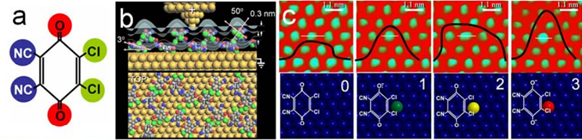 The concept of a wireless molecular circuit: a. The DDQ molecule. b. The DDQ bilayer’s atomic structure; side view (above); top view (below, Movie 1). T denotes a molecule on the top layer