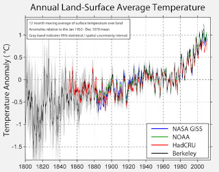 The Berkeley Earth Surface Temperature study finds reliable evidence of a rise in the average world land temperature of approximately 1°C since the mid-1950s.