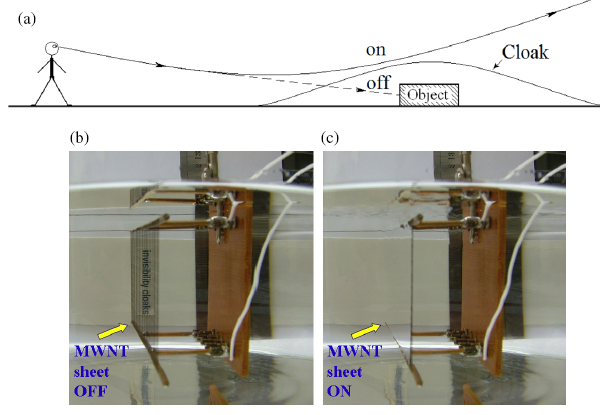 concealment cloak is demonstrated in water. These nanotube sheets are of considerable interest for loudspeakers and sonar projectors, and it is believed that this investigation of photothermal deflection will help optimize performance for these applications.