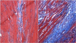In the study, a portion of a leg muscle was removed from mice. Untreated mice grew scar tissue (right image, blue area ). Mice receiving seeded microthreads had minimal scarring and regrew functional muscle (left image).