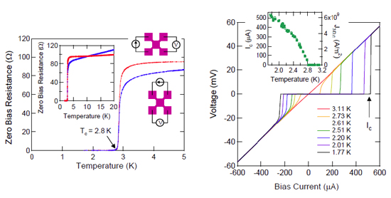 Figure (Left) Temperature dependence of zero bias resistance measured by attaching electrodes to a solid surface substance comprising an indium single atomic layer. The inset shows changes in a wider temperature region. Resistance becomes zero at a temperature of 2.8K. (Right) Bias current–voltage characteristics measured while changing temperature. When the bias current reaches the critical current value (Ic), superconductivity is destroyed and the substance switches to a state having normal resistance. The inset plots Ic and the critical current density (J3D,C) obtained from Ic, as functions of temperature.