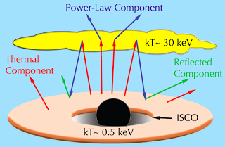 Schematic of the black hole and its accretion disk, from Gou et al. The ISCO is the innermost stable circular orbit and goes up to the edge of the gray ellipse that represents the edge of a Kerr black hole. “kT” refers to the energy of the X-ray photons emitted from either the disk or surrounding stellar material.
