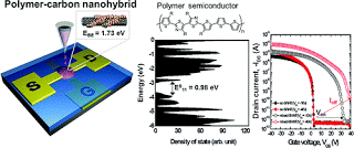 ACS Nano – Molecularly hybridized materials composed of polymer semiconductors (PSCs) and single-walled carbon nanotubes (SWNTs) may provide a new way to exploit an advantageous combination of semiconductors, which yields electrical properties that are not available in a single-component system. We demonstrate for the first time high-performance inkjet-printed hybrid thin film transistors with an electrically engineered heterostructure by using specially designed PSCs and semiconducting SWNTs (sc-SWNTs) whose system achieved a high mobility of 0.23 cm2 V–1 s–1, no Von shift, and a low off-current. PSCs were designed by calculation of the density of states of the backbone structure, which was related to charge transfer. The sc-SWNTs were prepared by a single cascade of the density-induced separation method. We also revealed that the binding energy between PSCs and sc-SWNTs was strongly affected by the side-chain length of PSCs, leading to the formation of a homogeneous nanohybrid film. The understanding of electrostatic interactions in the heterostructure and experimental results suggests criteria for the design of nanohybrid heterostructures.
