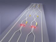 Artist’s impression of the quantum photonic chip, showing the waveguide circuit (in white), and the voltage-controlled phase shifters (metal contacts on the surface). Photon pairs become entangled as they pass through the circuit.