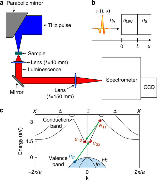 (a) Generated THz pulses are focused onto the GaAs QWs sample, and the luminescence is detected by a CCD camera after it has passed through a spectrometer. (b) The geometry of the sample interfaces with air (nA=1), QWs (nQW=3.5) and a quartz substrate (nS=2.1). We assume here that the QWs with thickness (L=6 μm) on the quartz substrate has a homogeneous refractive index (nQW=3.5) represented by the average of the refractive indices of the wells (nw=3.6) and barriers (nb=3.4). ɛi(t, x) is incident THz electric field from the air. (c) Electron-initiated impact ionization transitions in the schematic GaAs band structure for momentum in the Δ direction. The lattice constant a of GaAs is 5.6 Å, and ±2π/a corresponds to ±1.1×1010 m−1. The diagram shows electrons and hole positions before and after the transition at the threshold.