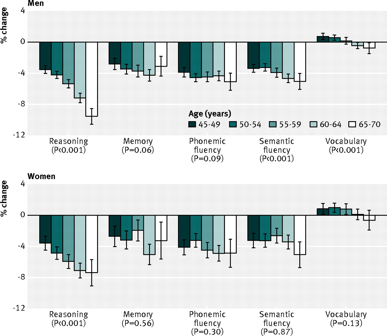 British Medical Journal – Timing of onset of cognitive decline: results from Whitehall II prospective cohort study University College London researchers found a 3.6% decline in mental reasoning in women and men aged 45-49.