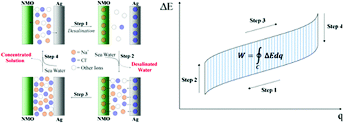 Fresh water is produced during the initial discharge of the electrodes (Steps 1−2), while recharging the electrodes results in the production of a brine stream (Steps 3−4).