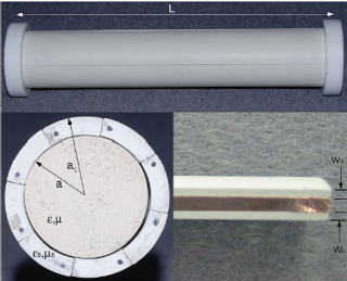 Photographs of: (top) the assembled cloak on the test cylinder with end caps; (bottom left) a cross-sectional view of the assembly with end cap removed; (bottom right) a shell segment edge with copper tape used to form the metallic strip for the metamaterial cloak.