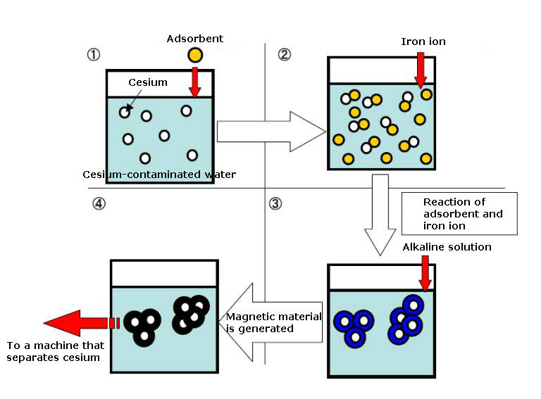 The technology separates cesium in water solution. First, water-soluble ferrocyanide, which works as an adsorbent, is added to cesium-contaminated water so that it is bonded with cesium. Then, the resultant material is reacted by using iron chloride, which is a material for magnetic substance.