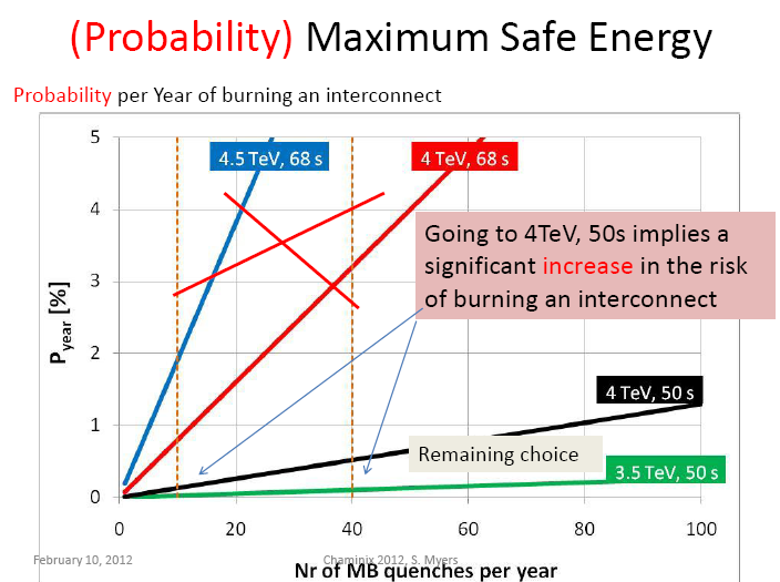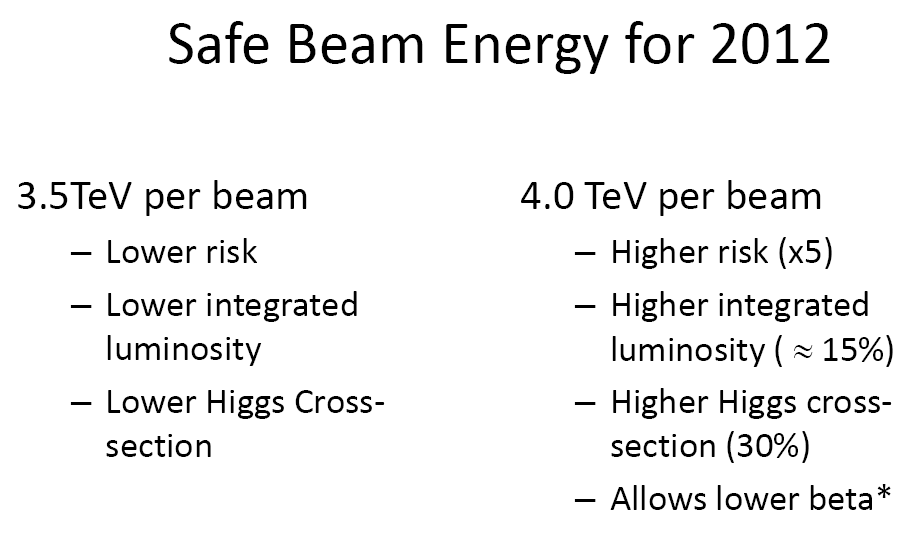 The Large Hadron Collider managers have decided to increase the energy of collisions to 4 TeV per beam, for a total energy of 8 TeV. Last year, the LHC smashed two beams of protons together at an energy of 3.5 teraelectronvolts (TeV) each, resulting in collisions with a total energy of 7 TeV.
