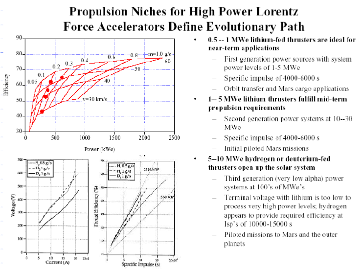 Magnetoplasmadynamic thrusters (MPDTs) are a subclass of plasma thrusters with an overwhelmingly electromagnetic acceleration mechanism involving the interaction of a current between an anode and a cathode and a magnetic fi eld which could be applied or induced by the current itself. This interaction gives rise to a Lorentz force density (f = j B) that accelerates propellant downstream and out of the thruster. The thrust generation mechanism of the self-fi eld MPDT is well understood and was characterized by Maecker and Jahn and analyzed by Choueiri. High thrust and thrust density are also the big advantages that MPDTs have over other types of electric propulsion devices, such as the Hall thruster or the ion thruster. MPDTs promise a wide range of thrust levels (100 mN – 100 N) that depends on the power level, along with high speci c impulse (1000-5000 s) a high thrust efficiency, (1025% with argon and up to 60% with lithium propellant), and the ability to process 100’s of kW in a single compact device.