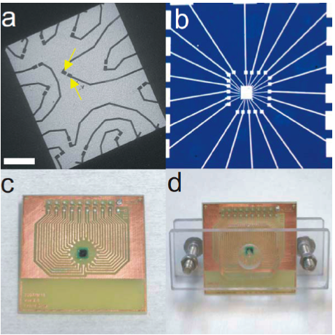 Images of representative devices. a. Low resolution TEM image of the central SiNx membrane part of a nanowire-nanopore chip. Scale bar = 20 μm. The central bright rectangle is the suspended SiNx membrane area with nanowire-nanopore FETs. Dark lines on the membrane are metal contacts. Yellow arrows point to the source and drain contact of a nanowire-nanopore FET (not visible in gap between two contacts). b. Optical image of the device side of the SiNx membrane chip. Image size = 1.6 mm × 1.6 mm. The central bright rectangle is the suspended SiNx membrane and bright stripes are metal lines connecting FET to the large metal wirebonding pads visible on the edges of this image. c. Photograph of a home-made PCB chip carrier with a SiNx membrane chip glued on. PCB board size = 4 cm × 4 cm. The central dark part is the SiNx membrane chip. Bright metal lines on the chip carrier are copper, which are used to interface the devices to outside instrumentation. A few wire bonding wires are visible between the chip and copper lines. d. Photograph of a PCB chip carrier with assembled PDMS chambers.