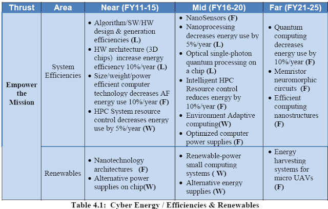The Air Force is considering science and technology areas that could ―change the game as regards cyber energy. Given the history of exponential advance of computing technology sustained across decades there is a reasonable expectation that game changers will continue to emerge and continue driving cyber quickly forward via innovations. Important technologies that have strong potential as game changers where the AF science and technology community is investing are quantum computing, nanotechnology, and superconducting materials.