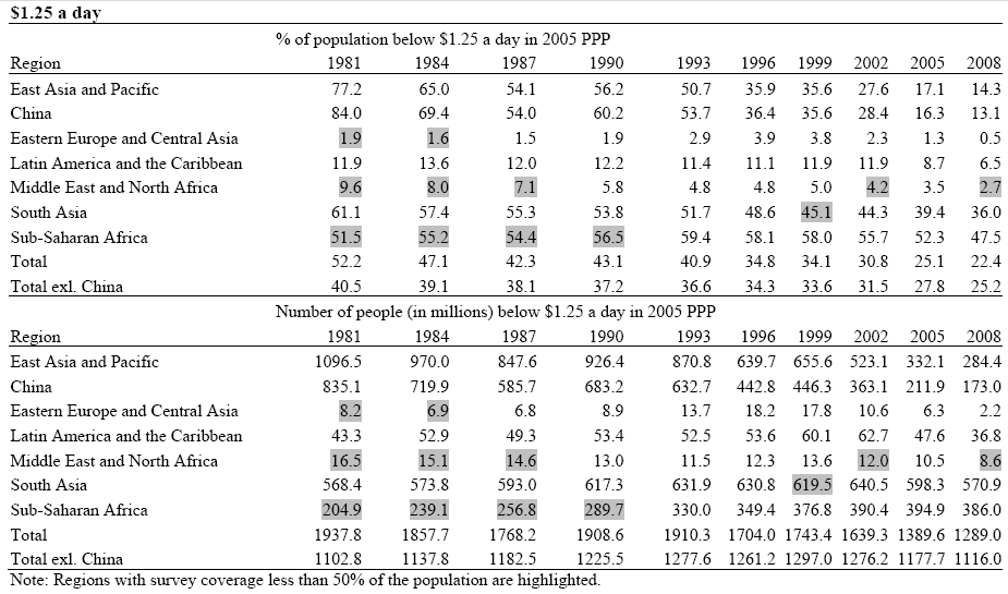 * In China alone, 662 million fewer people living in poverty by the $1.25 standard, though progress in China has been uneven over time. In 2008, 13% (173 million people) of China’s population still lived below $1.25 a day.