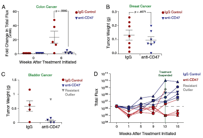 Next, the team transplanted human tumors into the feet of mice, where tumors can be easily monitored. When they treated the rodents with anti-CD47, the tumors shrank and did not spread to the rest of the body. In mice given human bladder cancer tumors, for example, 10 of 10 untreated mice had cancer that spread to their lymph nodes. Only one of 10 mice treated with anti-CD47 had a lymph node with signs of cancer. Moreover, the implanted tumor often got smaller after treatment — colon cancers transplanted into the mice shrank to less than one-third of their original size, on average. And in five mice with breast cancer tumors, anti-CD47 eliminated all signs of the cancer cells, and the animals remained cancer-free 4 months after the treatment stopped.