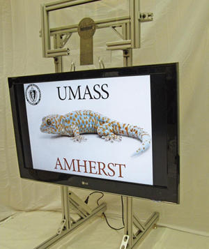 A card-sized pad of Geckskin can firmly attach very heavy objects such as this 42-inch television weighing about 40 lbs. (18 kg) to a smooth vertical surface. The key innovation by Bartlett and colleagues was to create a soft pad woven into a stiff fabric that includes a synthetic tendon. Together these features allow the stiff yet flexible pad to “drape” over a surface to maximize contact. (Credit: Photo courtesy of UMass Amherst)