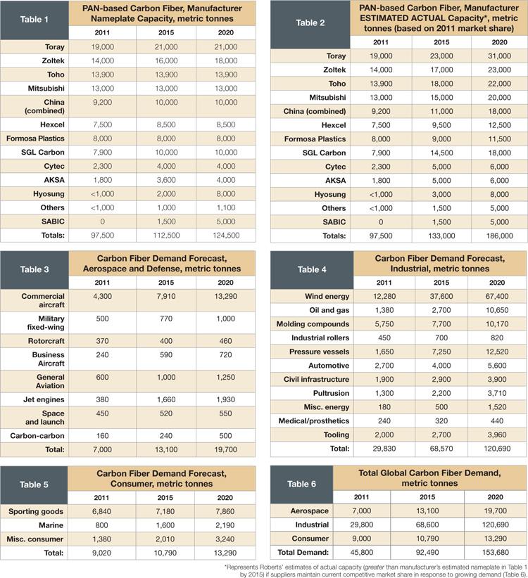 Red forecasts that aerospace demand (Table 3) will increase by 180 percent during the next decade, with 95 percent of that fiber delivered as unidirectional or woven prepregs. For industrial components (Table 4), he predicts 310 percent growth, with energy applications dominating the space. Consumer applications (Table 5), a more mature market, will grow a mere 47 percent in the next 10 years. By 2020, says Red, industrial uses will dwarf all others, with wind energy, by far, the largest in that space.