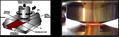 Friction stir welding joins metals using the heat of friction produced by a spinning pin tool pressed down on both pieces of metal at their common joint. Friction heating produced by the high-speed rotation causes both metal pieces to heat up to a “plastic” condition, but not to melt. As the tool passes down the common joint line, the heated, plasticized metal from both pieces is kneaded together in the rotating tool’s wake, forming the weld between them.