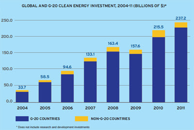 Among renewable technologies, solar increased globally by 44 percent, attracting $128 billion and accounting for more than half of all clean energy investment among members of the G-20. Dramatic price declines, with the cost of solar modules dropping by half in the past 12 months, fueled the activity. Wind prices also were lower in 2011.