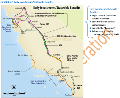 • Making early investments in the “bookends,” or San Francisco Bay Area and Los Angeles Basin regions, to upgrade existing services, build ridership, and lay the foundation for expansion of the high-speed system