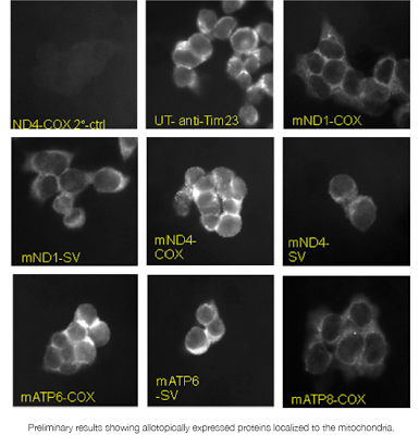 Thirteen proteins critical to the respiratory chain are encoded only in mitochondrial DNA. However, nuclear DNA is much less susceptible to damage and is more easily repaired. The goal of this project is to test whether these thirteen genes, when encoded in the nucleus, can successfully be expressed and integrated into the mitochondria.