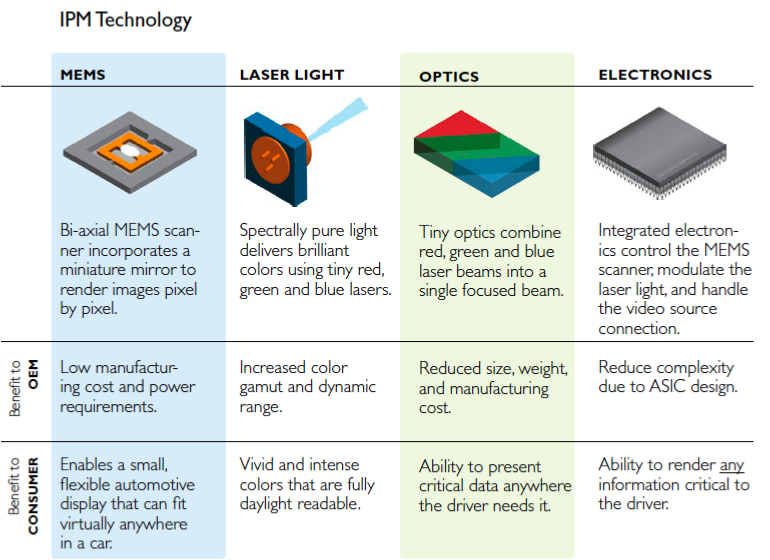 IPM is a miniature laser projection engine that provides automotive display manufacturers the power to create displays that boast exceptional image contrast, intense brightness, high-resolution and excellent dynamic color range.