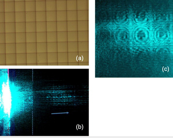 Figure 2. Light propagation through a rectangular cloak array formed by the gap between the gold-coated surfaces of a large microlens array (500 μm pitch, 56 mm lens radius) and a flat glass slide. (a) Microscope image of the gold-coated lens array. (b) Microscope image of 514 nm light propagation through the cloak array. Dashed line indicates the waveguide edge. Light propagation direction is indicated by the arrow. (c) Magnified image of 514 nm light propagation through the cloak array. Similar to [8], cloaked areas appear as dark circles surrounded by concentric rings.