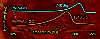 In situ reduction of graphene oxide (GO) at moderate temperatures within a polymer was observed using differential scanning calorimetry (DSC). Comparison of heats of reduction from DSC data in poly(vinylpyrrolidone), poly(vinyl acetate), and poly(vinylpyrrolidone/vinyl acetate) nanocomposites demonstrates that the polymer chemistry strongly influences the extent of reduction. These results are compared to the time–temperature relationship for GO reduction in air and in dimethylformamide at the same temperatures, determined through changes in the atomic carbon-to-oxygen ratio. GO reduction was independently confirmed by electrical conductivity and optical absorption measurements, as well as Raman spectroscopy. These results show that GO sheets are reduced depending on the time–temperature history and polymer chemistry at the particles’ location. For nanocomposites this can lead to improvement or reduction of desired properties and is thus pertinent to thermal processing of polymer nanocomposites based on functionalized graphene.