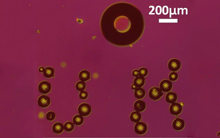 The UH microrobot (visible in the top center of the image) was used to position these 100-µm-diameter glass beads to form “UH”.