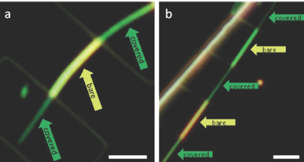 The middle segment of a bare Si nanowire (labeled “bare”) appears yellow while the two Au covered segments (labeled “covered”) appear green in color; b. This image shows a Si nanowire of which the diameter gradually decreases from the bottom left to the top right). The bare segments of the wire exhibit a color that changes from orange to green. The neighboring covered segments show a color change from yellow/green to blue/green. These observed color changes are consistent with the scattering spectra acquired by measurements and simulations presented in the main text. From the images above, it is also clear that for both wires, the covered segments appear thinner and exhibit a significantly reduced scattering intensity as compared to the neighboring bare segments. This is consistent with the predicted reduction in the scattering cross section of a Si nanowire due to plasmonic cloaking with by a properly designed Au cover.