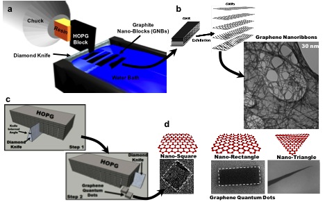 (a) A descriptive sketch of the nanotomy process showing the diamond-knife-based mechanical cleaving of HOPG block to produce GNBs for GNR production. Process parameters: dr=step-size and θv=angle of cleavage. (c) Sketch of the two-step nanotomy process to produce GNBs for GQD production. (b,d) GNRs and GQDs are produced by exfoliating the corresponding GNBs in chlorosulphonic acid (superacid). TEM micrographs of 30 nm GNRs and FESEM micrographs of GQDs of different shapes (square, rectangle and triangle).